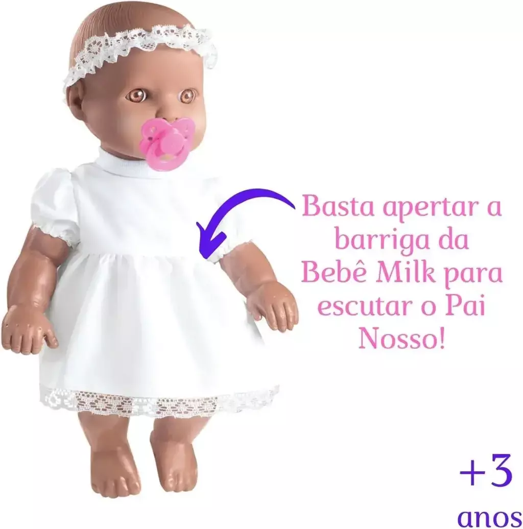 Ela é uma bonequinha de 32 cm que, ao apertar sua barriguinha, recita o Pai Nosso com uma voz suave, trazendo aconchego e um toque especial de espiritualidade para o dia da criança. Com corpo em vinil macio, roupinha delicada e sua inseparável chupetinha, ela é perfeita para pequenos a partir de 3 anos que adoram cuidar, abraçar e viver momentos de ternura. Uma companhia doce, acolhedora e cheia de significado!